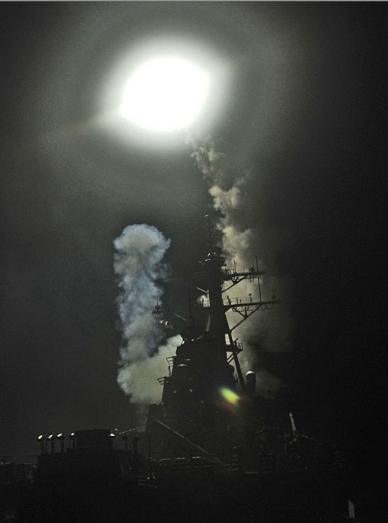 Nas fotos divulgadas pela Marinha dos EUA (USN), o destróier classe ‘Arleigh Burke’ USS Barry, DDG 52, lança um míssil de cruzeiro Tomahawk em apoio à ‘Operation Dawn’ (Operação Amanhecer, ou Alvorada). Aproximadamente 110 mísseis Tomahawk foram lançados pela USN e pela Royal Navy (Marinha Real) na operação, segundo o Departamento de Defesa dos EUA (DoD).