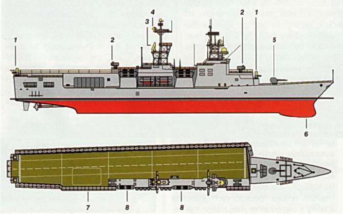 O desenho acima é da versão final que começou a ser construída e seria chamado de CVE USS Santa Fe: 1 – Phalanx; 2 – Sea Sparrow; 3 – radar SPS-40E; 4- radar SPQ-9A; 5 – canhão Mk.45 de 127mm; 6 – sonar SQS-53B; 7 – elevador; 8 – chaminés.