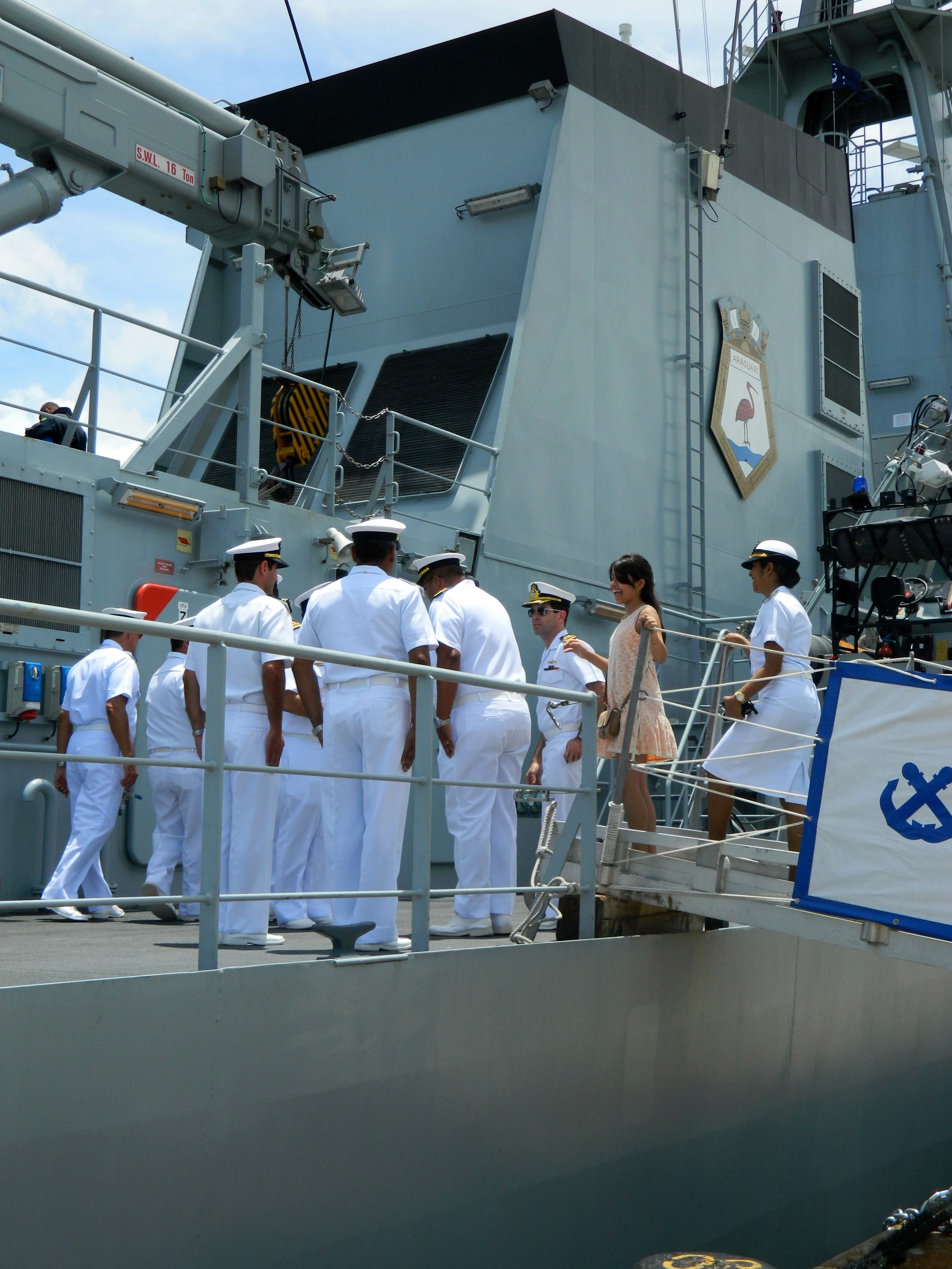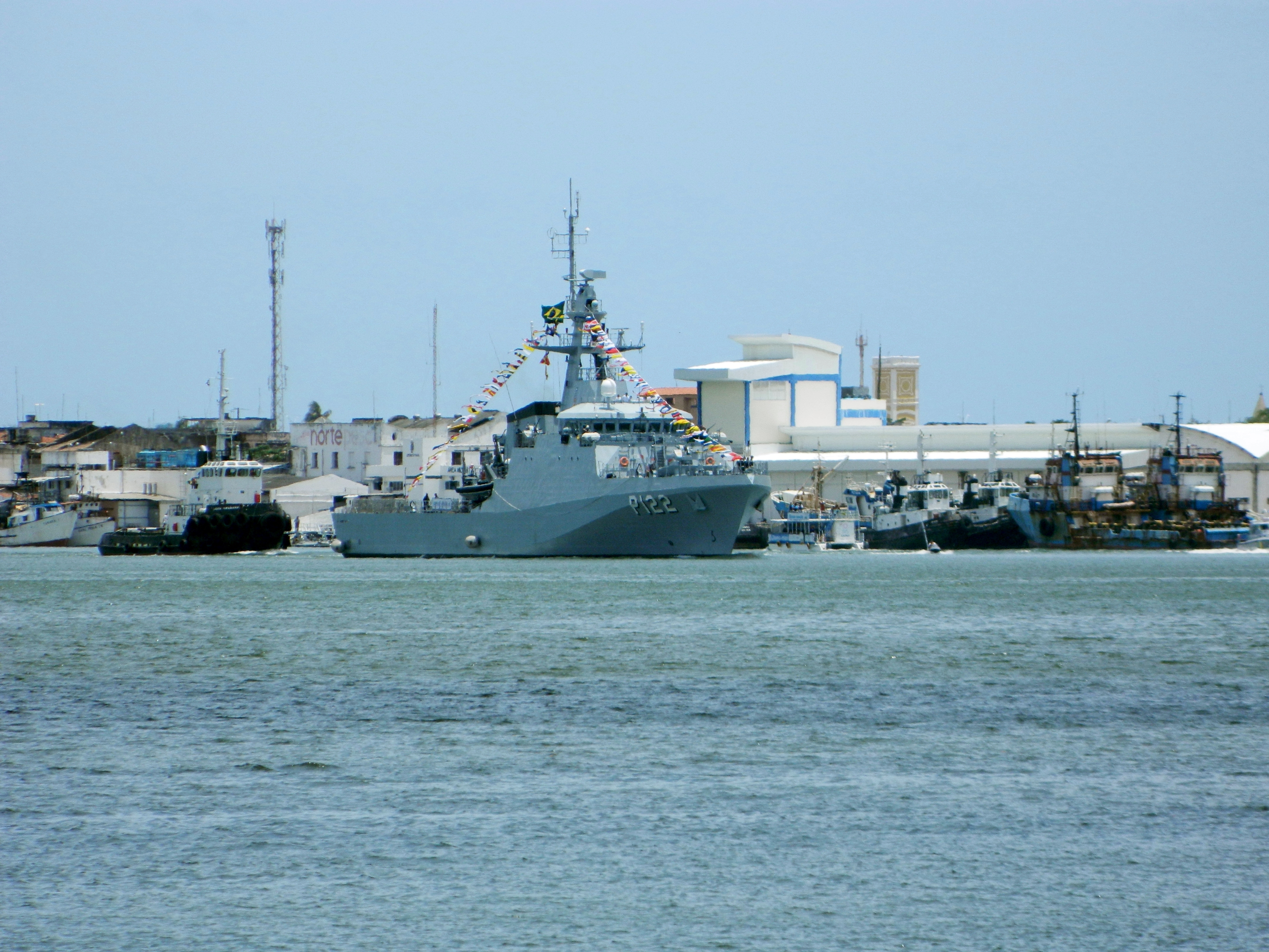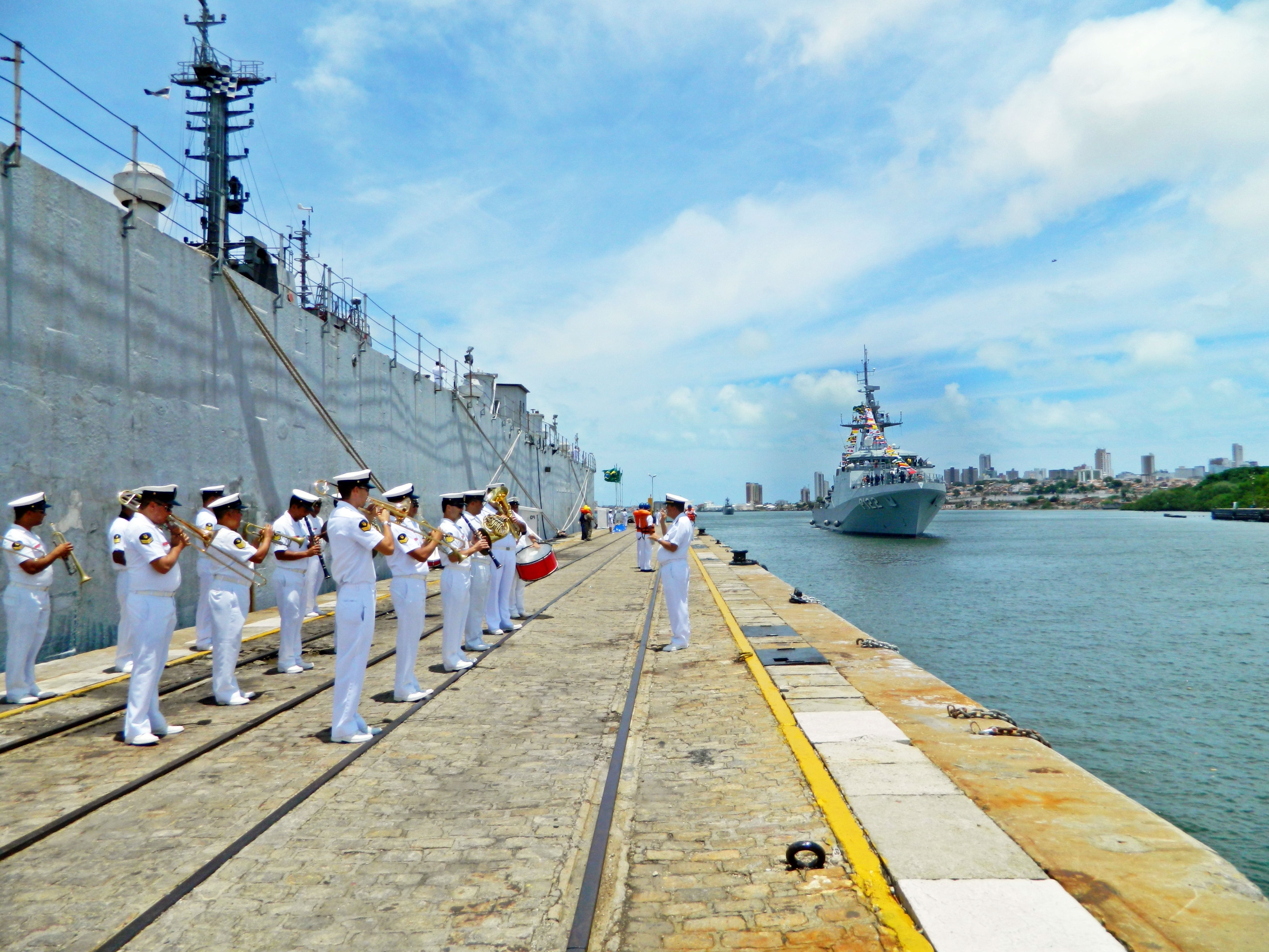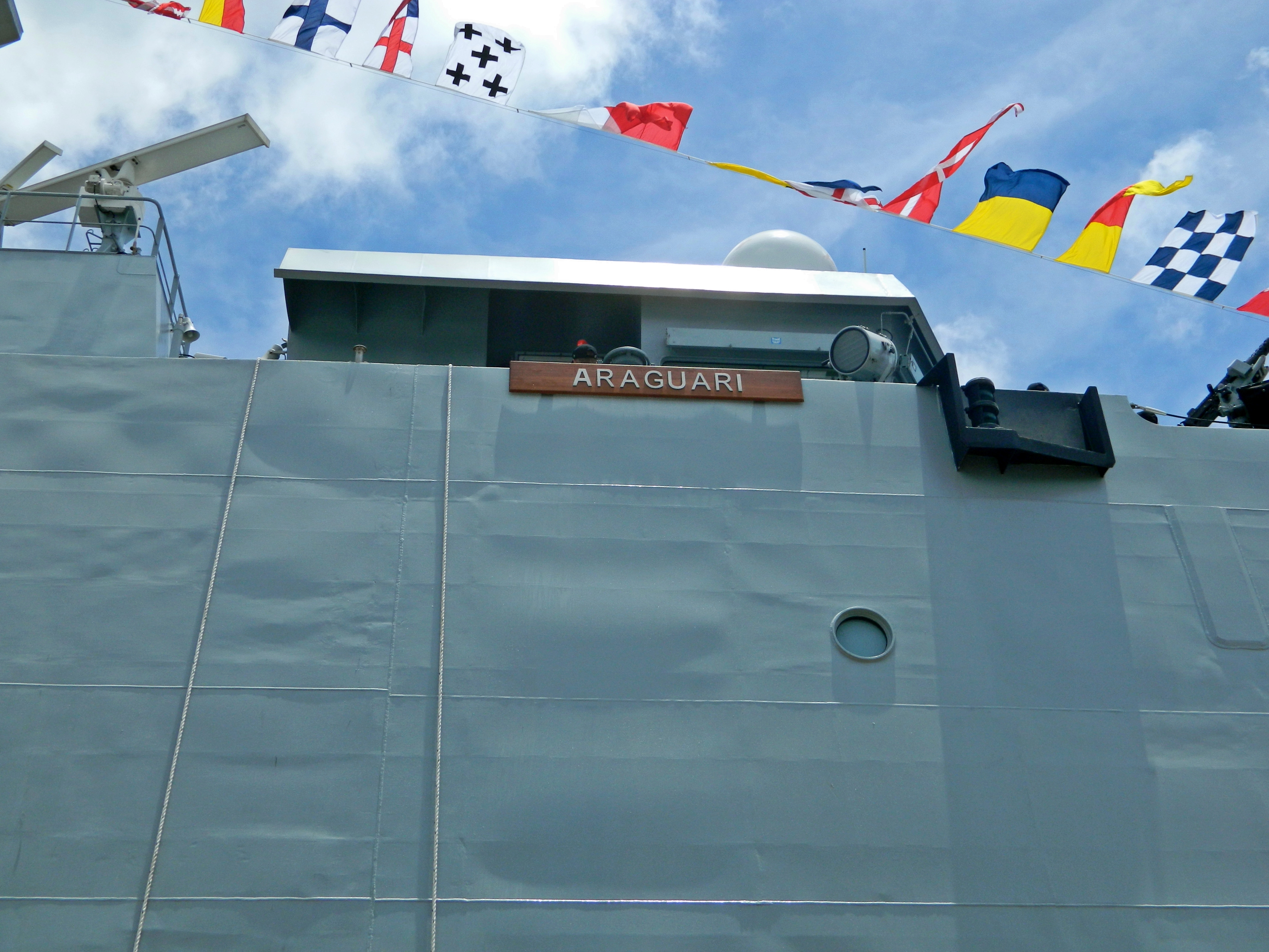 O Vice-Almirante Miranda, Comandante do 3º Distrito Naval, proferiu boas-vindas aos tripulantes do navio e externou seu júbilo pela chegada do navio. O Capitão-de-Corveta Robledo, Comandante do NPaOc Araguari, agradeceu as boas-vindas recebidas em nome de toda tripulação e proferiu palavras motivacionais, finalizando com brado: “Cão-de-Guarda, pela Amazônia Azul”. Tendo resposta da tripulação: “Porque navegar é preciso!”