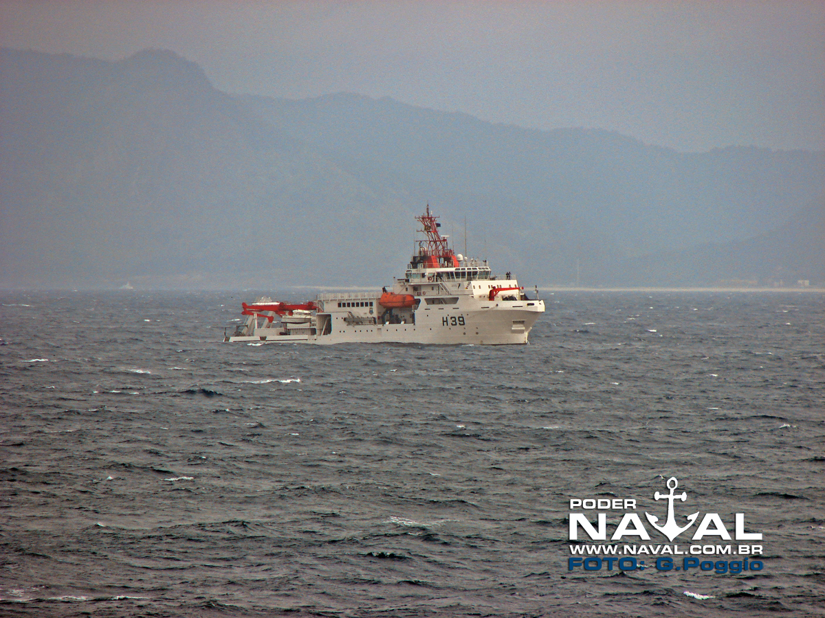 E nesta ele aparece à direita do navio de pesquisa hidroceanográfico Vital de Oliveira (de pintura branca).