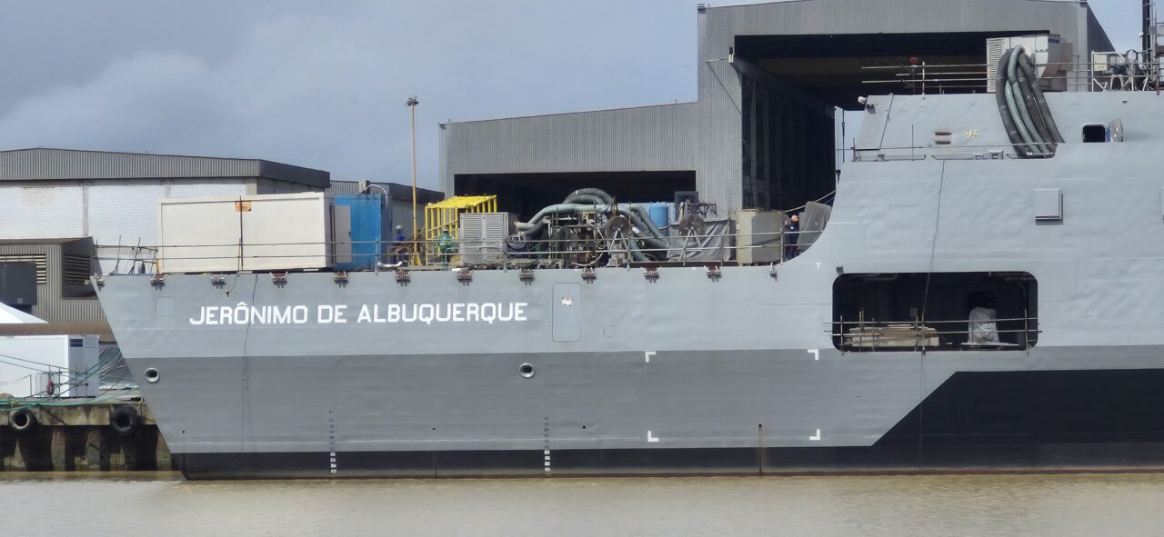 Itajaí (SC) — As imagens enviadas gentilmente pelo nosso leitor MMerlin BR mostram as fragatas Tamandaré (F200) e Jerônimo de Albuquerque (F201) atracadas no cais do estaleiro Thyssenkrupp Brasil Sul (tkEBS), em Itajaí, em fase avançada de acabamento e integração de sistemas. As fotos revelam o casco pintado, a superestrutura montada e os primeiros componentes instalados, preparando os navios para os próximos testes operacionais.