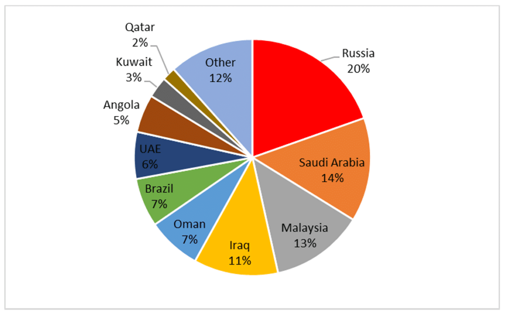 Além disso, nem mesmo a Rússia que é a maior fornecedora tem mais do que 20% da exportação para a China, porque a política de fornecimento desenvolvida pelo estado chinês é cada país não ter mais de 20% da pauta exportado para a China.